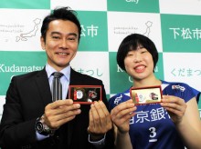 下松市のマスコットキャラクター「くだまる」と「笠戸島レモンサイダー」