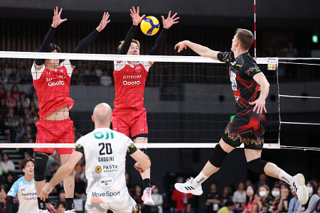 バレーボール男子の国際親善試合。日本のSVリーグ昨季王者のサントリーは、イタリア1部リーグのペルージャに0―3で屈した。7日の試合に続いて敗れた。写真はブロックするサントリーの高橋藍(中央)=8日 【時事通信社】