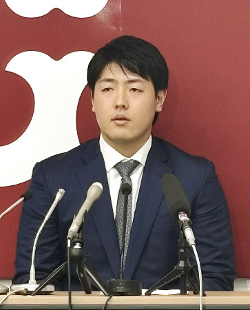 巨人は22日、岡本和真内野手(29)が今オフにポスティングシステムを利用して米大リーグ球団と移籍交渉することを認めると発表した。写真は、記者会見で大リーグ挑戦への思いを語る岡本=東京都千代田区 【時事通信社】
