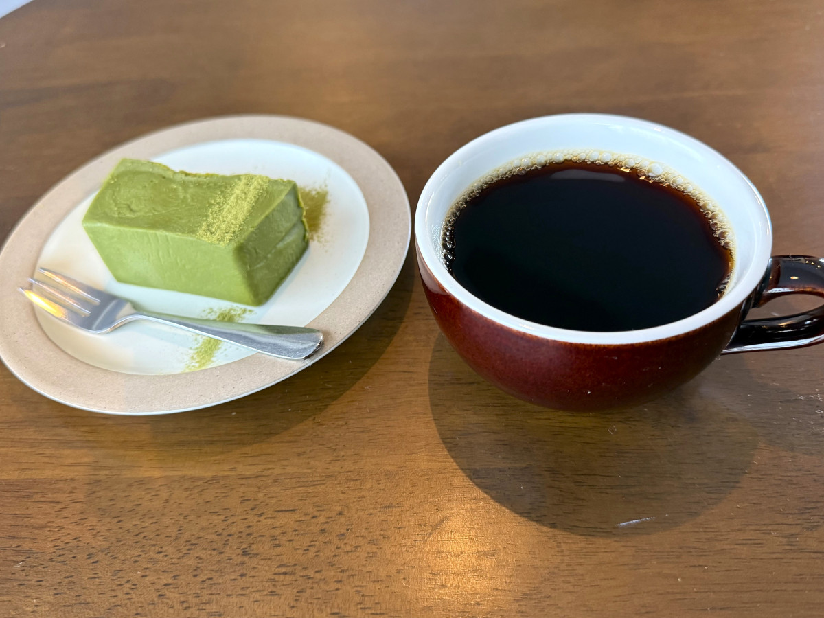 シェアキッチン「cafe terrace」で日曜限定営業をするカフェ「ibasyo」が提供する抹茶のテリーヌとコーヒー