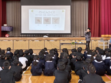 サッカーJ2「レノファ山口FC」アンバサダーの山瀬功治さんが1月16日、下松市立花岡小学校(下松市末武上)で新体カテストの運動指導を行った。