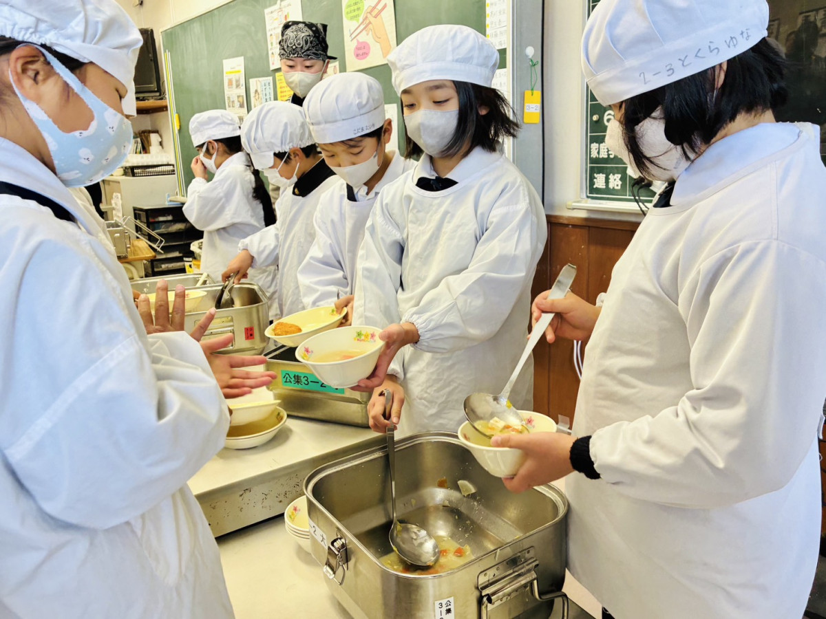 下松市公集小の「下松給食の日」 配膳する児童