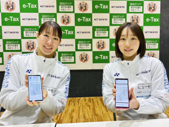 山口・徳山税務署が1月26日、女子バドミントンチーム「ACT SAIKYO」の練習拠点「Merry Gateアリーナ」(周南市栗屋)で電子申告・納税システム「e-Tax」のPRイベントを開き、同チームの選手が参加した。