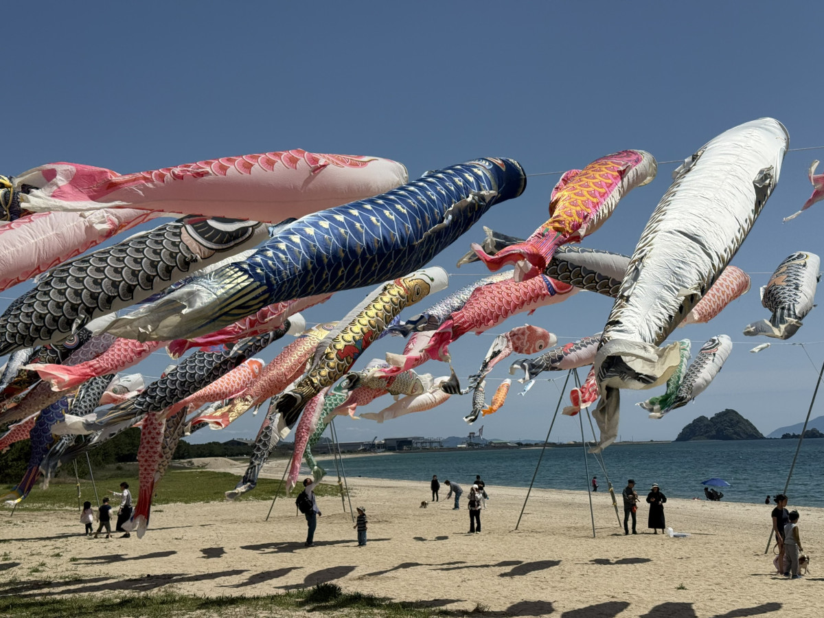 虹ケ浜海岸に掲げられた約140匹のこいのぼり