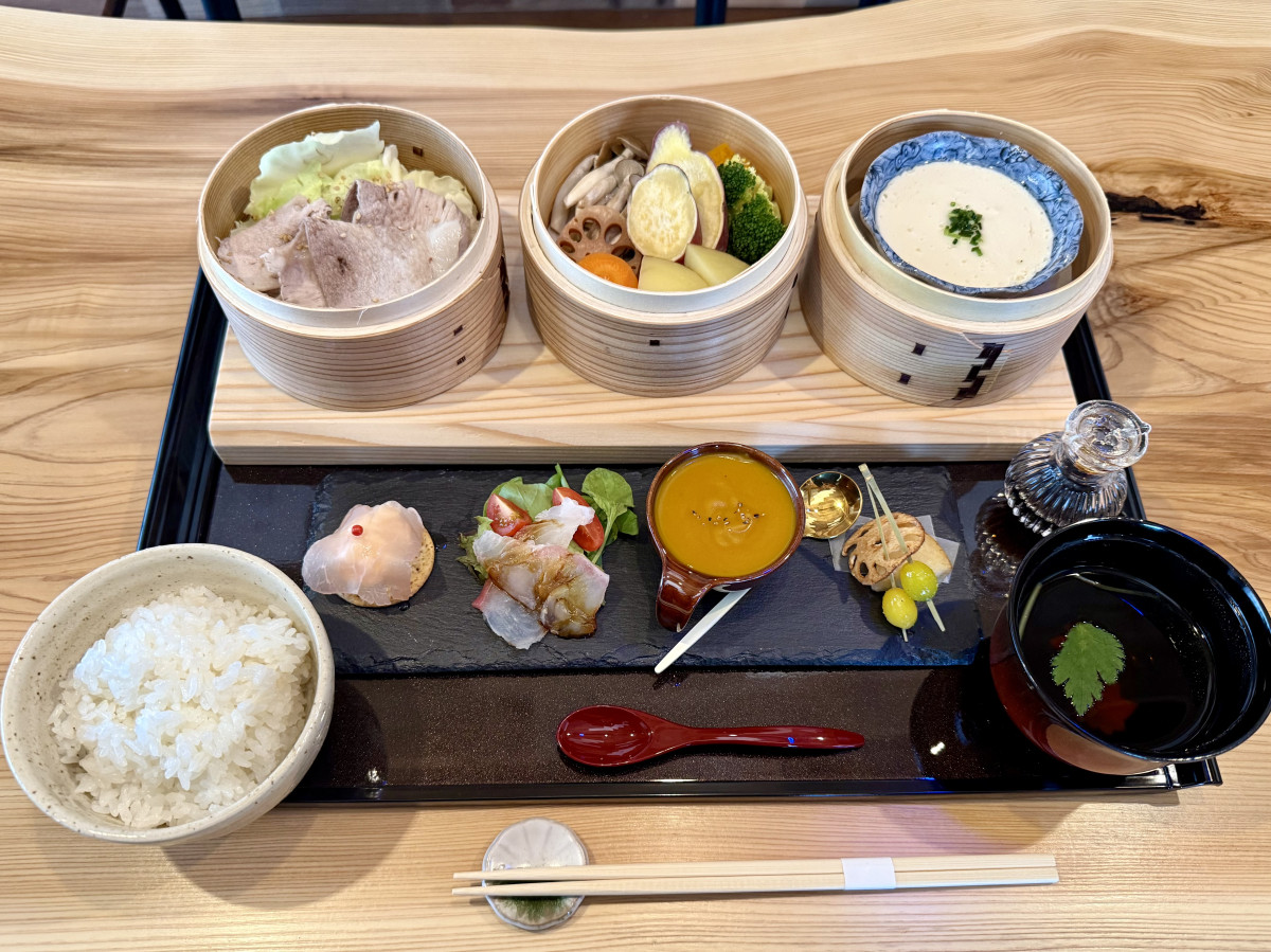 周南の食事処「優縁」 3段のせいろで提供する「季節の蒸篭(せいろ)御膳」