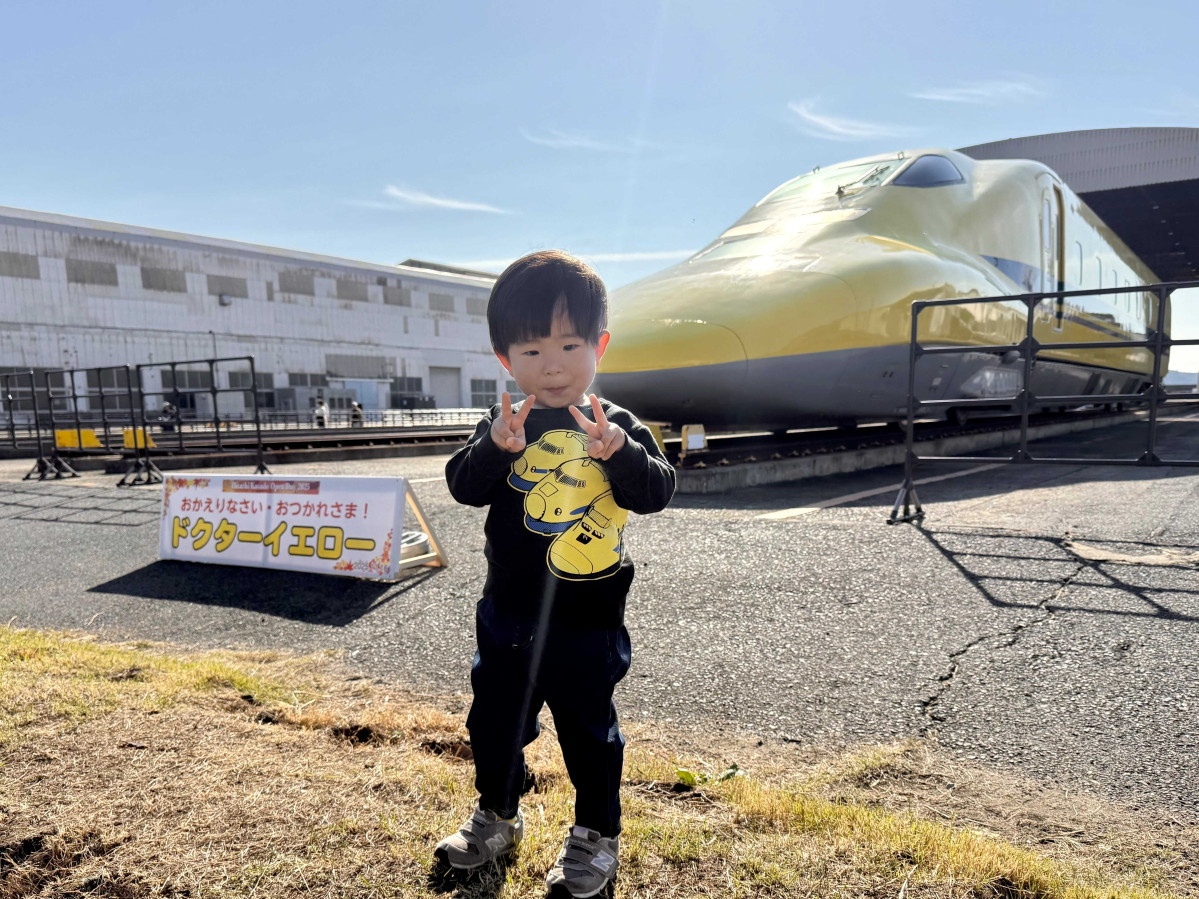 「ドクターイエロー」T4編成の先頭車両と記念撮影する子ども(日立製作所笠戸事業所の工場開放イベント「Hitachi Open Day 2025」の様子)