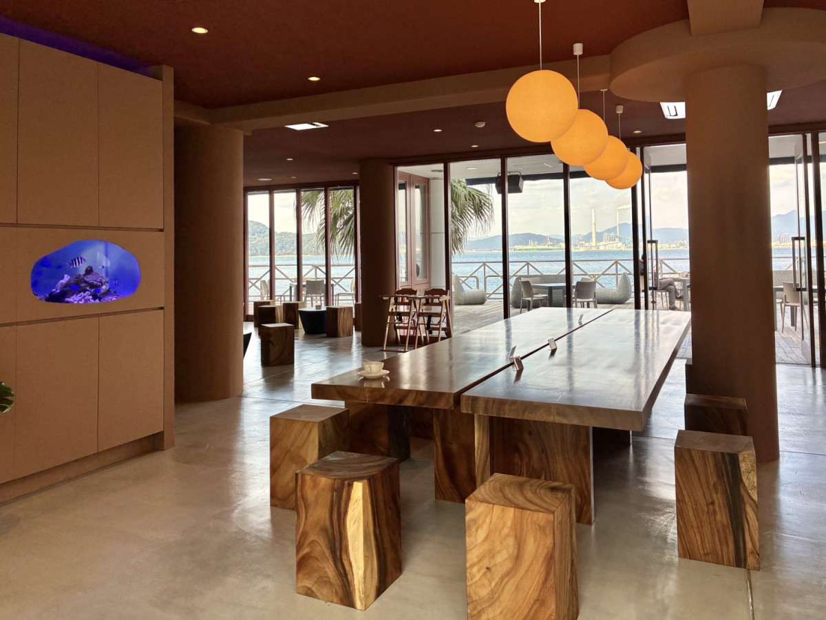 モンキーポッド材を使ったテーブルやスツールが並ぶベーカリーカフェ「YUNAGI Cafe」の店内
