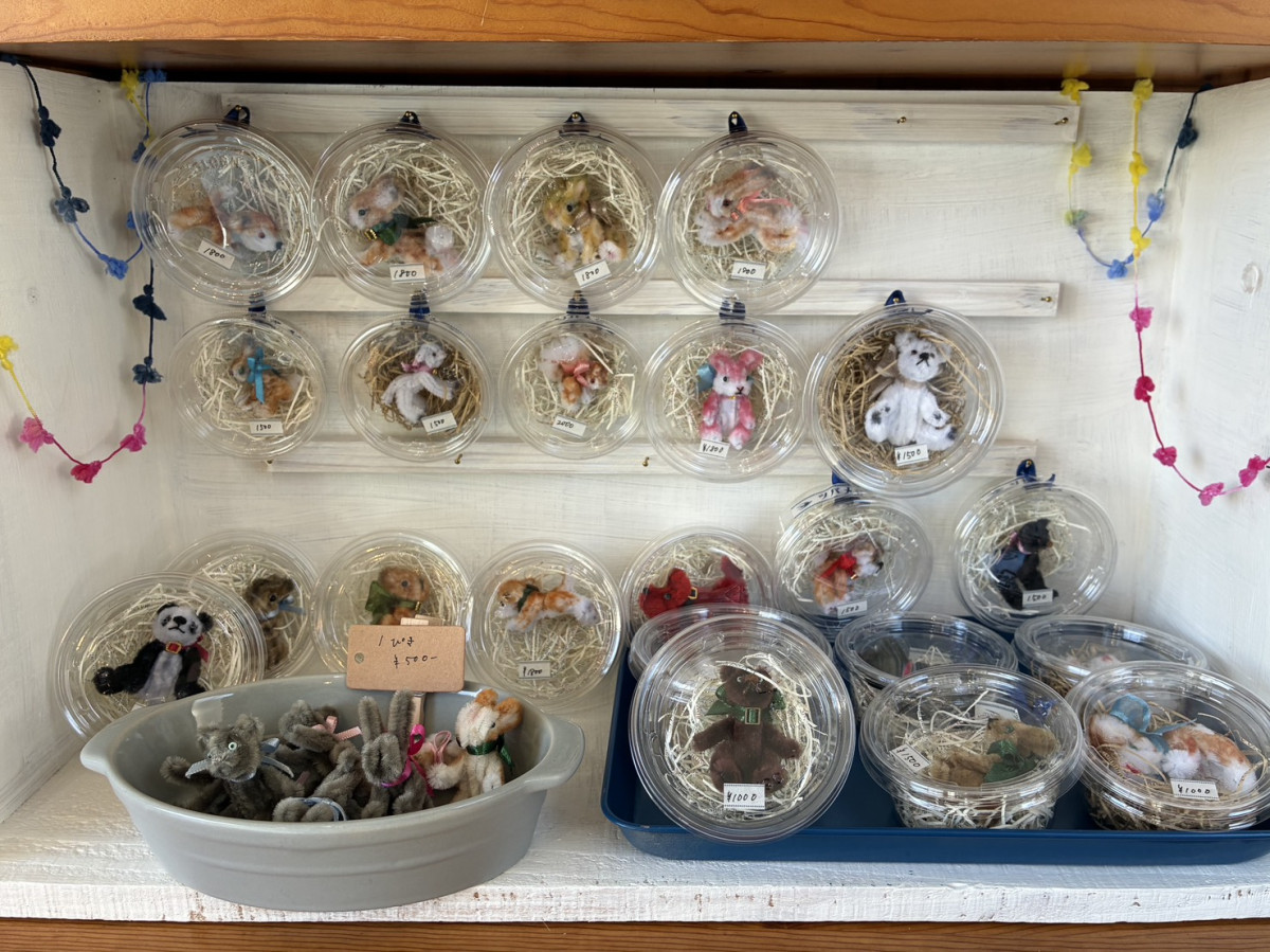 田布施町のカヌレと雑貨を扱う店「ツバメ舎」のモール人形や並ぶディスプレイ