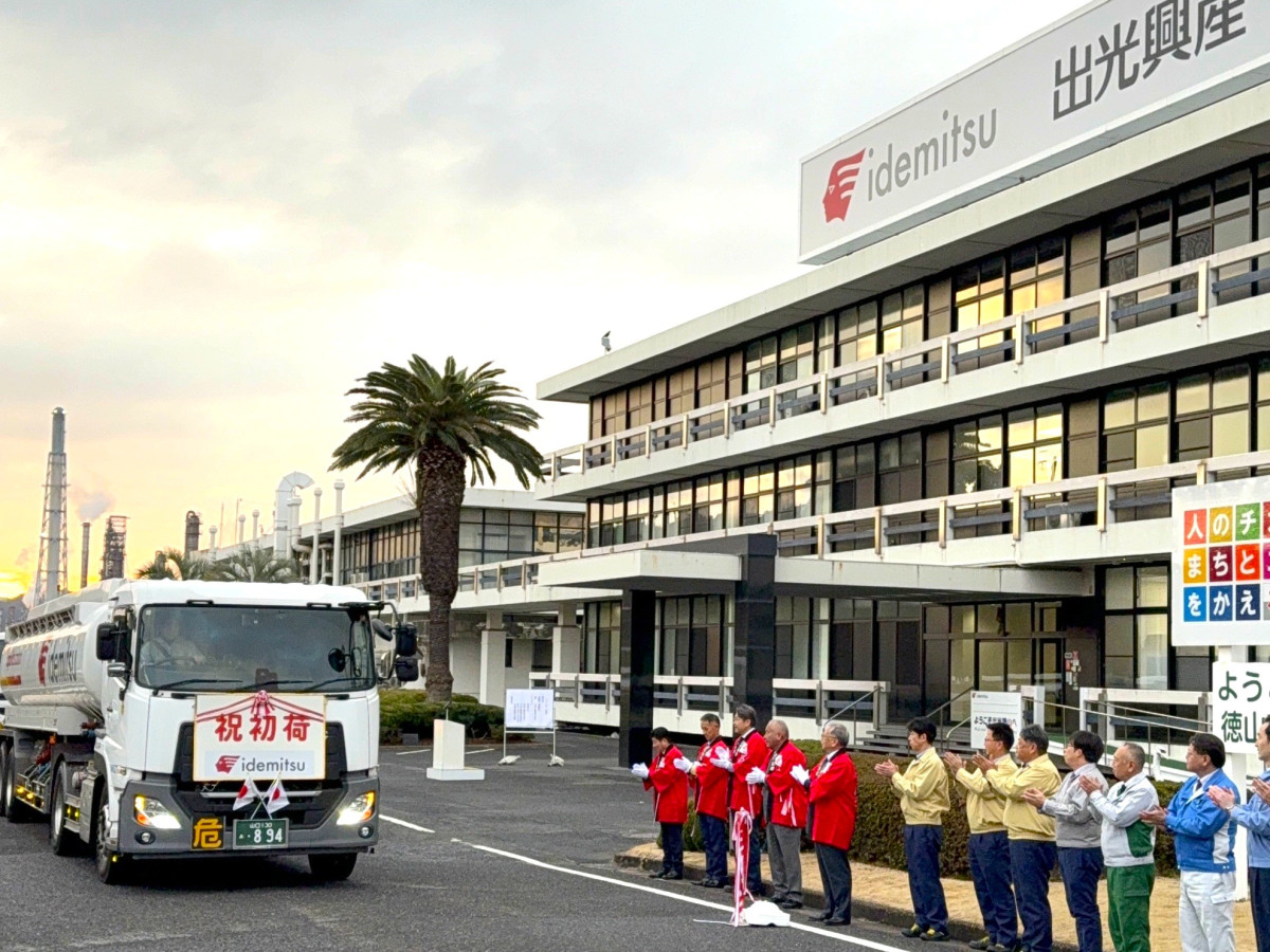 出光興産徳山事業所(周南市新宮町)が1月3日、新年恒例の「初荷式」を行い、ガソリンなどを積んだタンクローリーを送り出した。