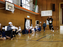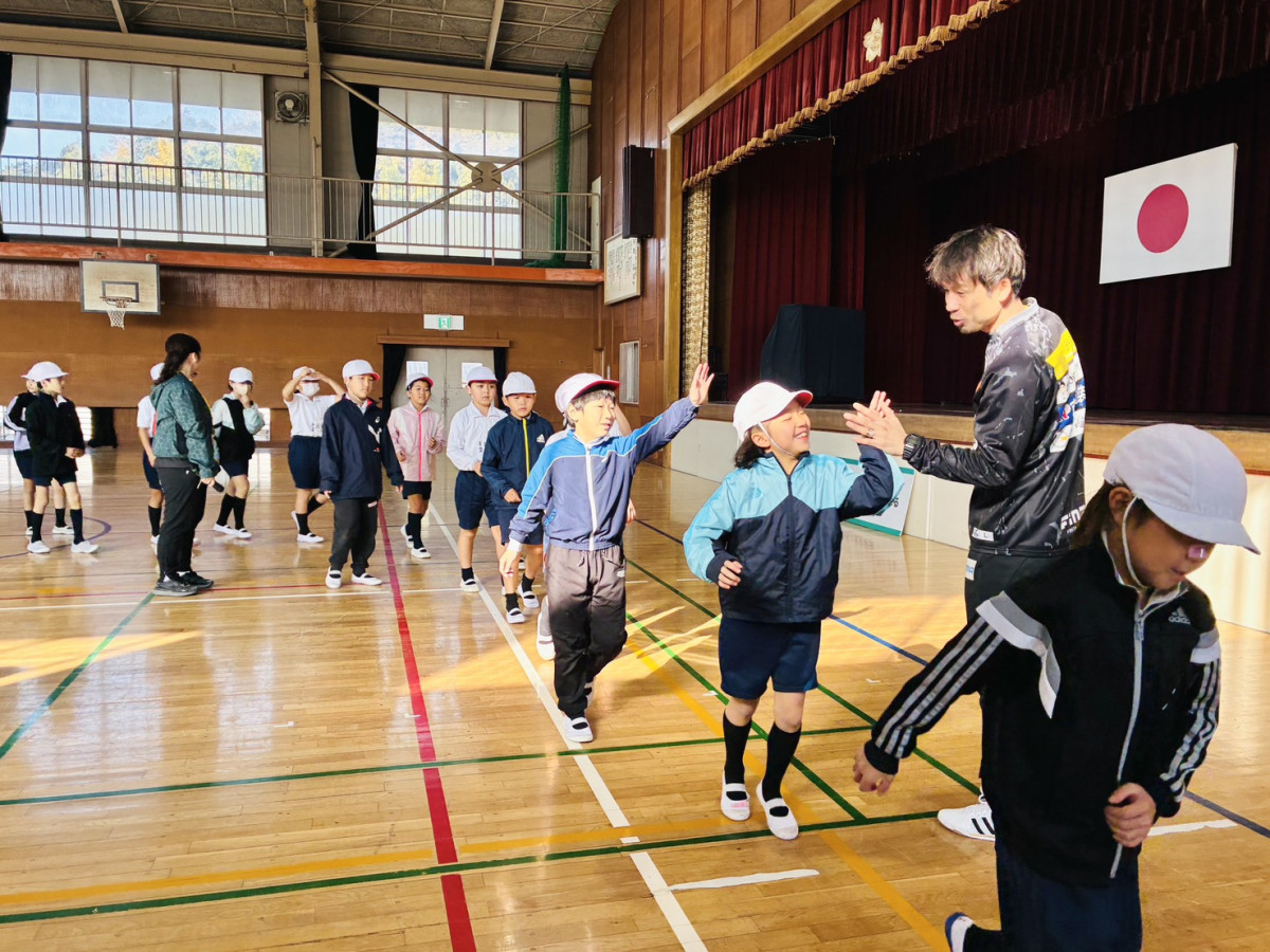 サッカーJ2「レノファ山口FC」アンバサダーの山瀬功治さんが1月16日、下松市立花岡小学校(下松市末武上)で新体カテストの運動指導を行った。