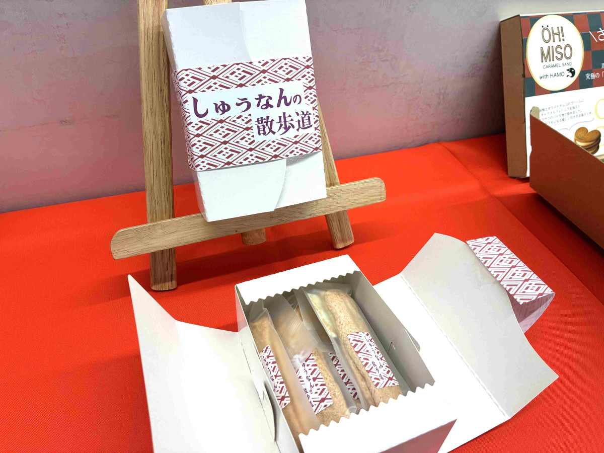 初開催の特産品ブランドコンテスト「周逸グランプリ 2025」で最終審査に進んだ鹿野産大豆のきな粉を使ったダックワーズ「しゅうなん散歩道」(和・洋菓子 なかがわ)