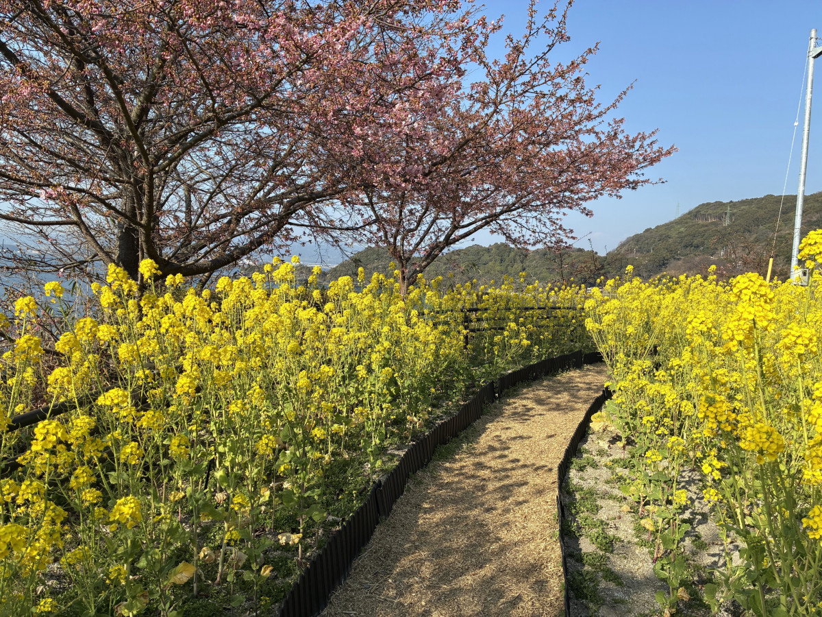 下松市笠戸島の県道沿いにある広場「潮風ガーデン」の河津桜と菜の花