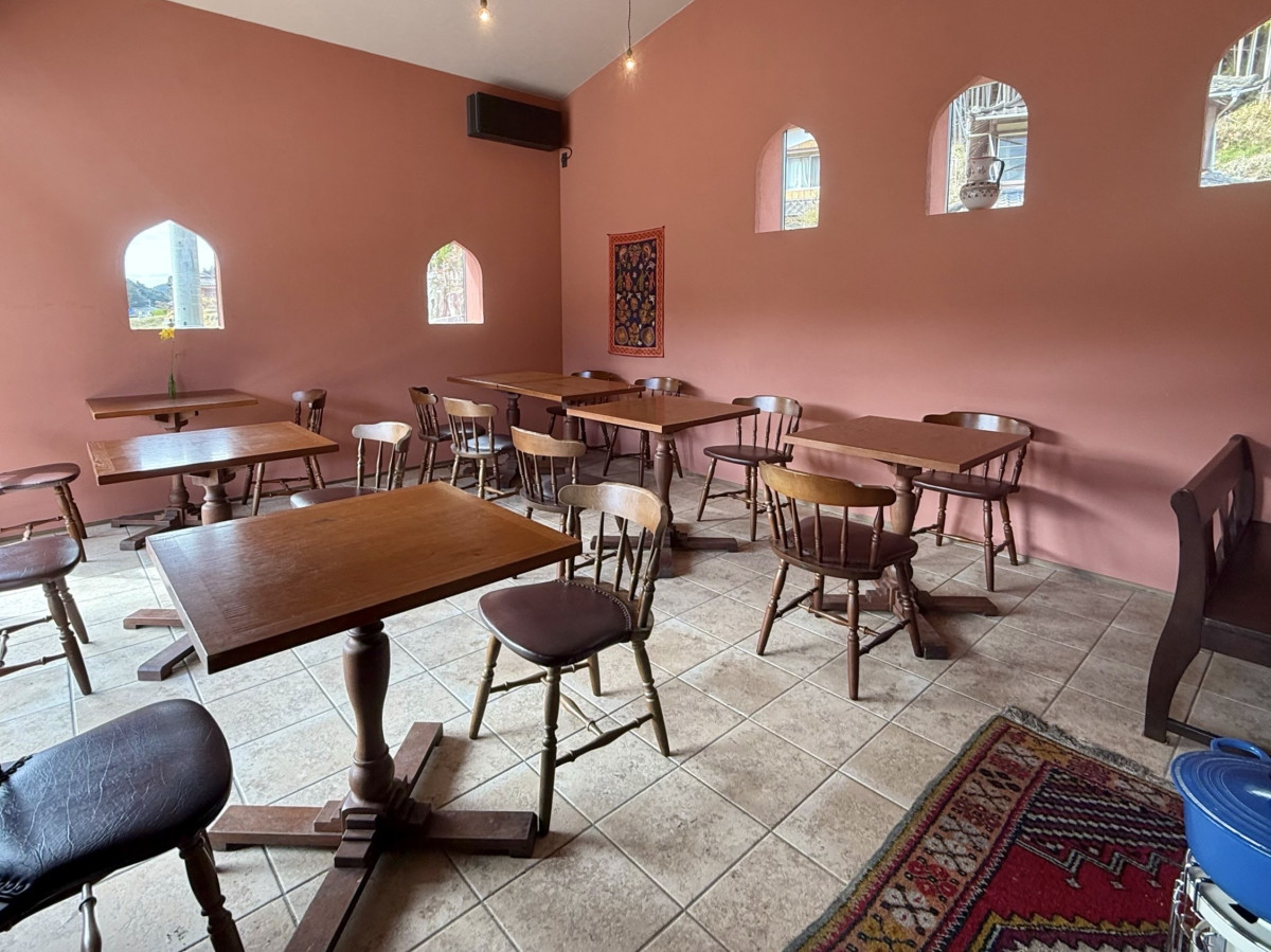 光市の南インドカレー専門店「南印度カレー食堂 カレーの木」の店内の様子。イスラム建築風のアーチを象ったかたどった小窓を設置する。