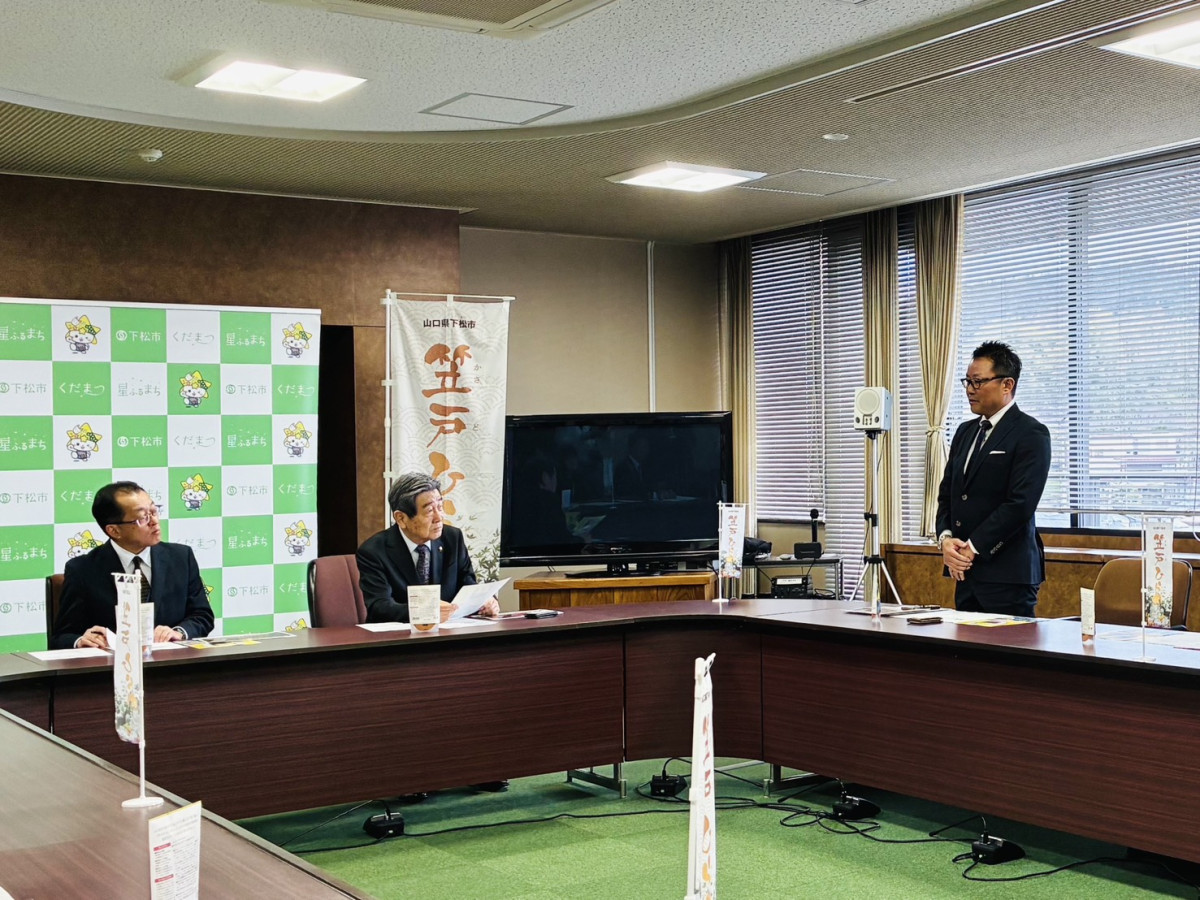 下松特産の「笠戸ひらめ」を使った新商品「瀬戸内ヒラメとオマール海老のビスク」の開発に関わった関係者が3月13日、下松市役所を訪れ、国井益雄市長に報告と商品PRを行った。